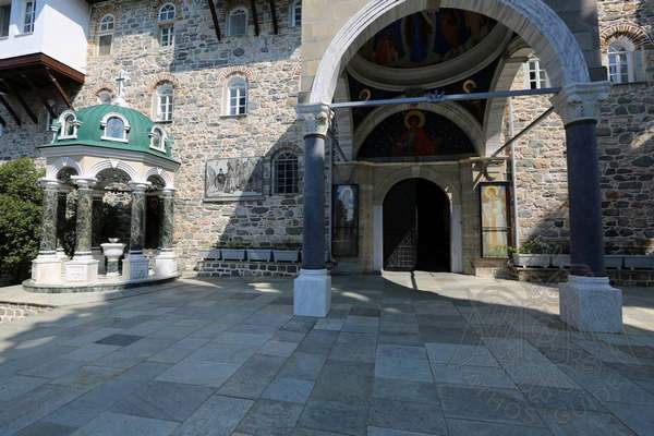 Η κύρια είσοδος της μονής βρίσκεται στη νότια πτέρυγα. Έχει προστώο με πρόσφατες τοιχογραφίες. Μπροστά της ανοίγεται μεγάλη αυλή που περιβάλλεται από τις παραθαλάσσιες πτέρυγες και το ανακαινισμένο αρχονταρίκι. Ένα διαβατικό με σταυροθόλιο οδηγεί στην αυλή, η οποία είναι ευρύχωρη, πλακόστρωτη, με πλήθος οπωροφόρων δέντρων και παρτέρια.